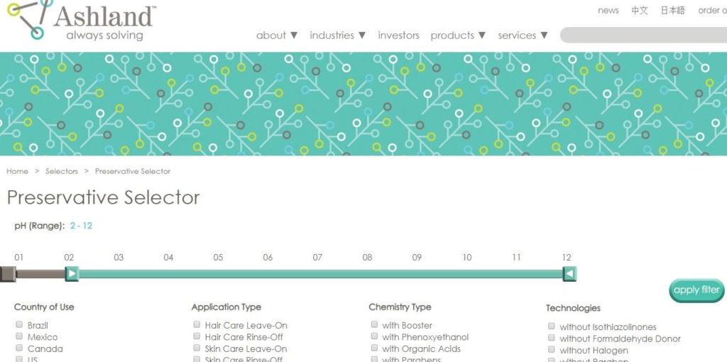 Who helps you to select the right preservative? Ashland do. The new Ashland preservative selector tool allows you to determine the appropriate ‘antimicrobial technology” based on your specific and dynamic criteria like pH-value, cosmetic application and chemistry/technology type. Once a preservative technology has been selected, the tool provides quick links to the product detail information.